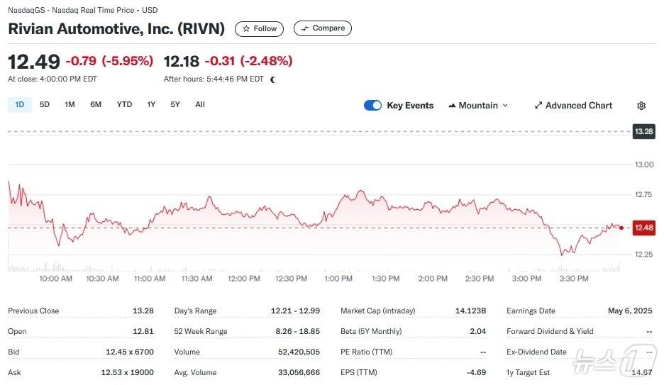 리비안 일일 주가추이 - 야후 파이낸스 갈무리관련 키워드리비안1분기 인도량전기차박형기 기자 “지금이라도 메모리 반도체에 베팅하라”-블룸버그“TSMC 랠리로 코스피 11일 연속 신고가 행진”-블룸버그관련 기사테슬라 5.47%-리비안 7.69%, 전기차 일제 급락(상보)테슬라 5% 급등-리비안 6% 급락, 전기차 혼조(종합)트럼프 관세 발표 앞두고 불확실성 해소 기대, 미증시 일제↑(상보)테슬라 1.67% 하락-루시드 4.31% 급등, 전기차 혼조(상보)테슬라 3.51%-리비안 4.69%, 전기차 일제 급락(종합)