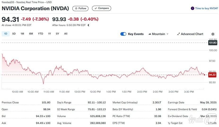 엔비디아 일일 주가추이 - 야후 파이낸스 갈무리관련 키워드엔비디아반도체주무역전쟁박형기 기자 “지금이라도 메모리 반도체에 베팅하라”-블룸버그“TSMC 랠리로 코스피 11일 연속 신고가 행진”-블룸버그관련 기사나스닥 1% 급락…트럼프발 금융규제·연준 압박에 '휘청'[뉴욕마감]메타 11% 폭락, 미증시 일제 하락…나스닥 1.58% 급락(상보)'엔비디아 랠리' 미증시 일제↑ 3대지수 3일 연속 사상 최고(상보)무역전쟁 완화+실적 기대, 미증시 일제 1% 이상 상승(상보)지역은행 부실 대출 급증, 금융 불안…미증시 일제 하락(상보)