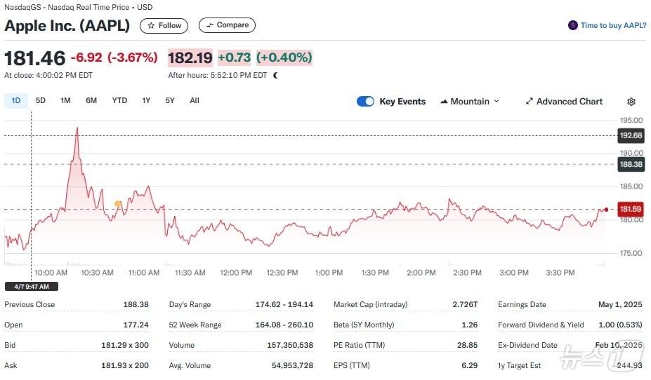 애플 일일 주가추이 - 야후 파이낸스 갈무리관련 키워드애플트럼프관세박형기 기자 “지금이라도 메모리 반도체에 베팅하라”-블룸버그“TSMC 랠리로 코스피 11일 연속 신고가 행진”-블룸버그관련 기사[뉴욕마감] 나스닥 0.03%↓…산타랠리 무산됐지만 금리인하 기대감"美, FTA 공동위 취소 통보…한국 디지털 규제에 불만"자체칩에 배터리 용량은 찔끔…가격 인상 갤S26 "커지는 우려"트럼프, JP모건·블랙록 등 월가 거물들과 비공개만찬삼성 갤럭시S26 가격 인상?…AP·메모리 부품 가격 '급등' 여파