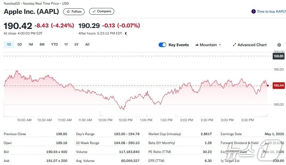 애플 일일 주가추이 - 야후 파이낸스 갈무리관련 키워드애플아이폰트럼프관세박형기 기자 “지금이라도 메모리 반도체에 베팅하라”-블룸버그“TSMC 랠리로 코스피 11일 연속 신고가 행진”-블룸버그관련 기사자체칩에 배터리 용량은 찔끔…가격 인상 갤S26 "커지는 우려"삼성 갤럭시S26 가격 인상?…AP·메모리 부품 가격 '급등' 여파MS, 오픈AI 지배구조 전환에 장중 시총 4조달러 돌파…애플도 합류(종합)애플, 시가총액 4조 달러 돌파…엔비디아·MS 이어 세 번째무역전쟁 완화+실적 기대, 미증시 일제 1% 이상 상승(상보)