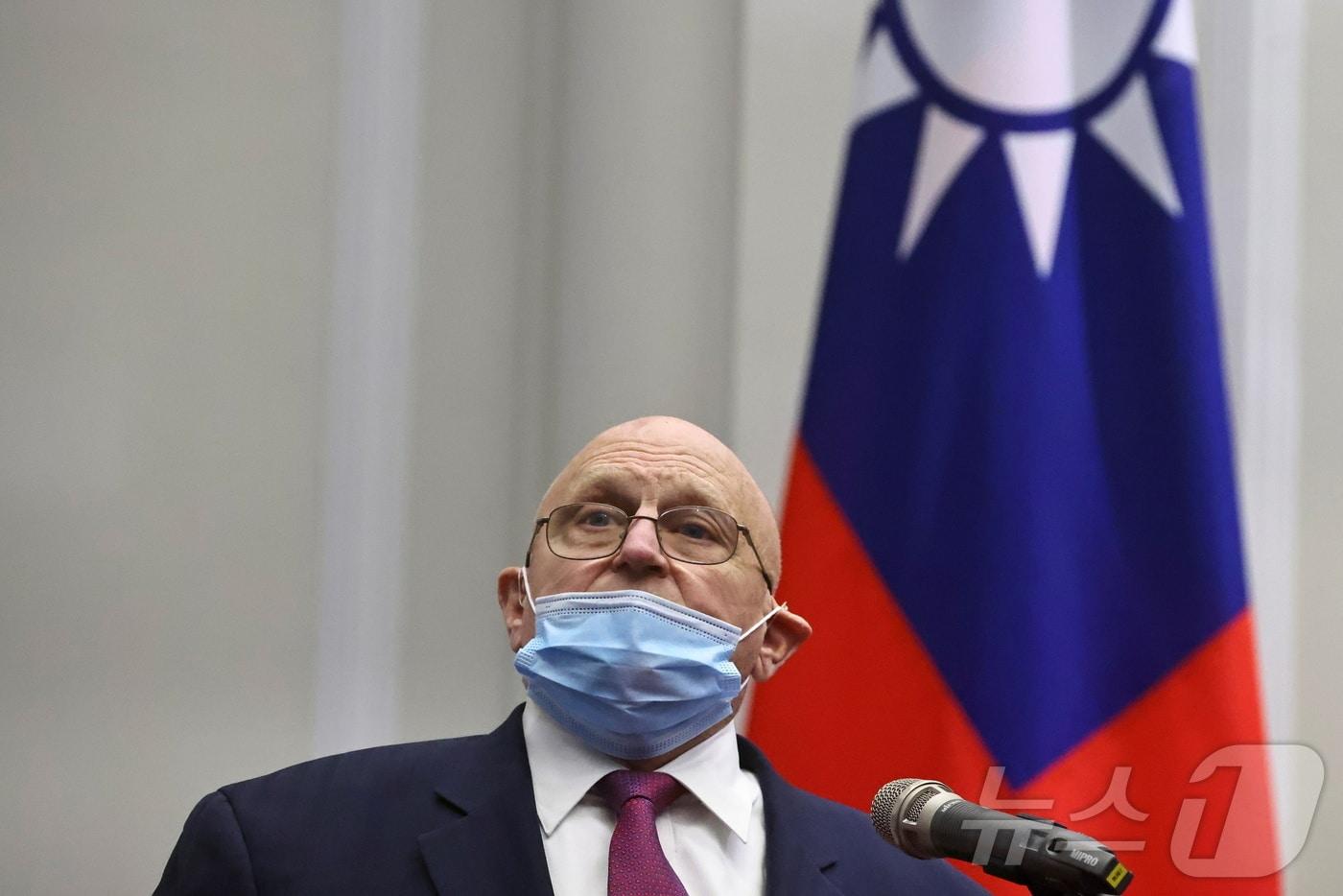 지난 2021년 4월 15일 조 바이든 미국 대통령이 대만으로 파견한 특사단의 일원인 리처드 아미티지 전 미국 국무부 부장관이 타이베이 총통부에서 차이잉원 대만 총통과 만난 자리에서 발언하고 있다. 2021.04.15 ⓒ 로이터=뉴스1 ⓒ News1 김지완 기자