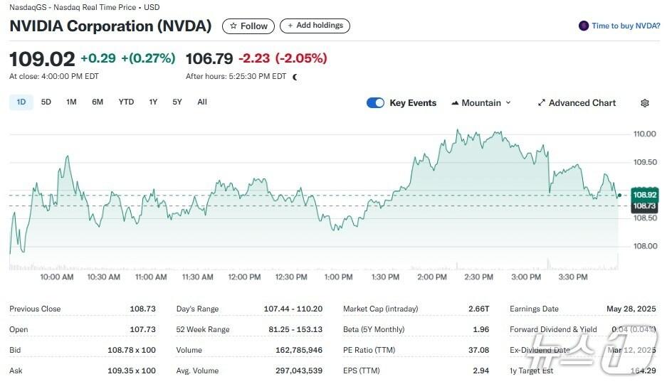 엔비디아 일일 주가추이 - 야후 파이낸스 갈무리관련 키워드엔비디아AI칩수출규제트럼프관세박형기 기자 엔비디아 0.06% 상승, 반도체지수 0.47%↑(상보)엔비디아 제약사 일라이 릴리에 10억달러 투자, 0.06% 상승관련 기사"中, 이번 분기 내 엔비디아 H200 칩 수입 승인 예정"S&P 0.6% 상승, 사흘 연속 올라…산타랠리 기대감 고조[뉴욕마감]美, 엔비디아 H200 中수출선적 검토 시작…AI칩 수출규제 완화美 엔비디아 H200 중국 수출 허용…셈법 복잡해진 K-반도체"엔비디아, AI 칩 밀수 방지용 '위치 확인 소프트웨어' 개발"