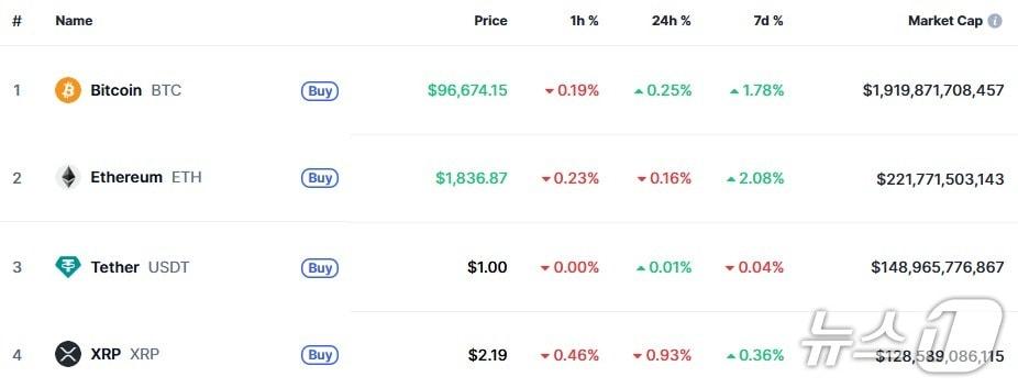 이 시각 현재 주요 암호화폐 시황 - 코인마켓캡 갈무리관련 키워드Blockchain비트코인리플이더리움박형기 기자 [속보] 비트코인 3% 이상 상승, 9만7000달러 회복"이란 대규모 시위 주요 은행 파산에서 시작돼"-WSJ관련 기사CPI 둔화 암호화폐 랠리, 비트 9.5만달러 회복-리플 5%↑(종합)CPI 둔화, 암호화폐 일제 랠리…비트 9.4만 회복-리플 4%↑(상보)[속보] 비트코인 3% 상승 9만4000달러 회복-리플도 4%↑파월 소환장에 암호화폐 피난처 부상…비트 9.2만달러 회복(상보)리플 영국 당국 거래 승인에도 2.04달러까지 추락(상보)