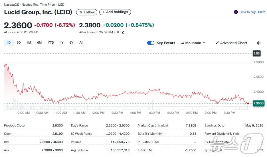 루시드 일일 주가추이 - 야후 파이낸스 갈무리관련 키워드루시드전기차사우디아라비아박형기 기자 한국 기업 암호화폐 투자 허용 추진, 비트 9만2000달러 회복(상보)[속보] 비트코인 2% 상승, 9만2000달러 회복관련 기사테슬라 4.93%-리비안 1.57%↑ 전기차 일제 랠리(상보)테슬라 2.42%-루시드 6.72%, 전기차 일제 급락(종합)테슬라, 사우디아라비아 사업 개시…"온라인 주문 서비스 도입"