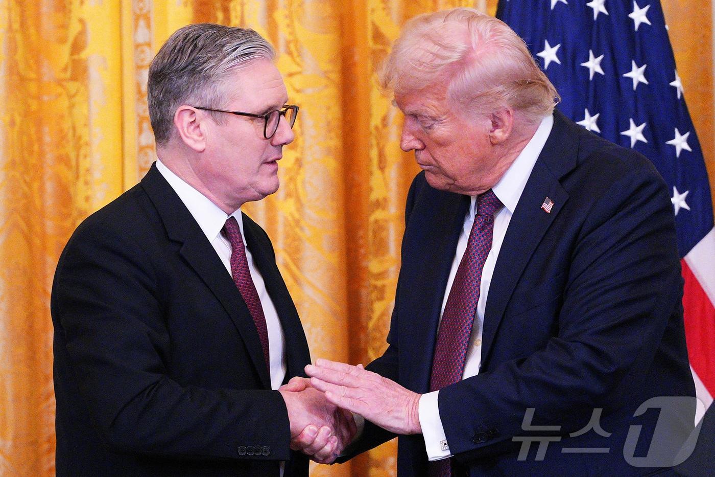 도널드 트럼프 미국 대통령과 키어 스타머 영국 총리가 27일(현지시간) 워싱턴 백악관에서 정상회담을 마친 뒤 기자회견 중 악수를 하고 있다. 2025.,02.28 ⓒ 로이터=뉴스1 ⓒ News1 우동명 기자