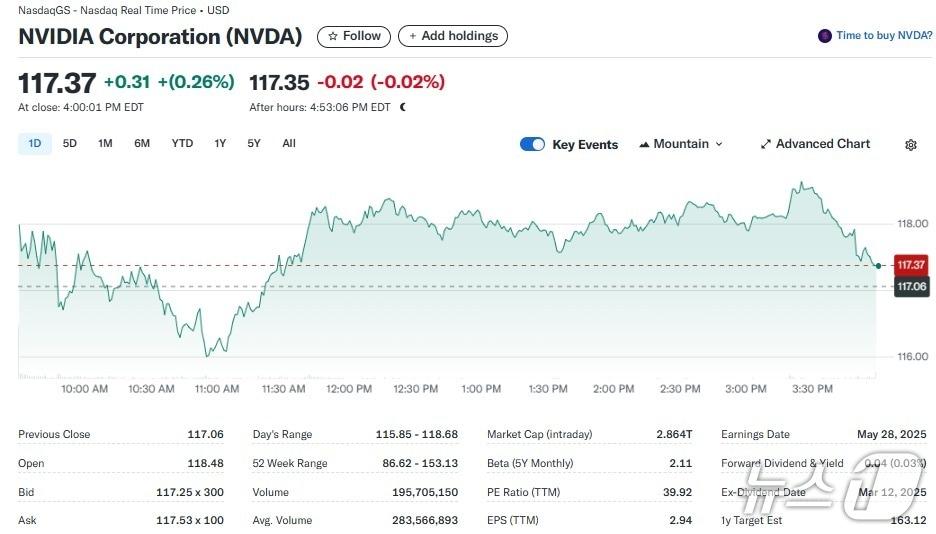 엔비디아 일일 주가추이 - 야후 파이낸스 갈무리관련 키워드엔비디아반도체주박형기 기자 한국 기업 암호화폐 투자 허용 추진, 비트 9만2000달러 회복(상보)[속보] 비트코인 2% 상승, 9만2000달러 회복관련 기사엿새째 최고가 마감한 코스피…이번 주 향방 가를 변수는?인텔 10.80% 폭등, 반도체지수도 2.73% 급등(종합)반도체주 랠리에도 엔비디아는 0.08% 하락고용 악화, 금리 인하 기대↑ 다우-S&P500 사상 최고치(상보)외인 순매도에 코스피 4500선 '위태'…삼전·SK하닉, 동반 하락[개장시황]
