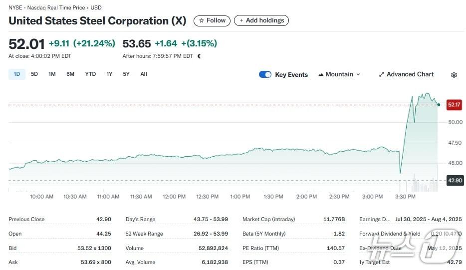 US스틸 일일 주가추이 - 야후 파이낸스 갈무리관련 키워드일본제철US스틸트럼프인수합병박형기 기자 18일 오전 6시 마이크론 실적 발표, 또 AI 주 급락하나中 GPU 업체 메타X 상장 첫날 주가 755%까지 폭등관련 기사트럼프 행정부, 美최대 리튬광산 개발사 지분 5% 인수"트럼프, '황금주' 행사해 US스틸 미국 공장 생산 중단 막아"-WSJ일본제철, 美 '전기로 제철소' 건설 계획…5.5조원 투입'공장건설에 보조금' 뒤집고 '지분과 교환'…트럼프 구상 파장美상무 "반도체 보조금으로 인텔 지분 확보…공짜 지원 안될 일"