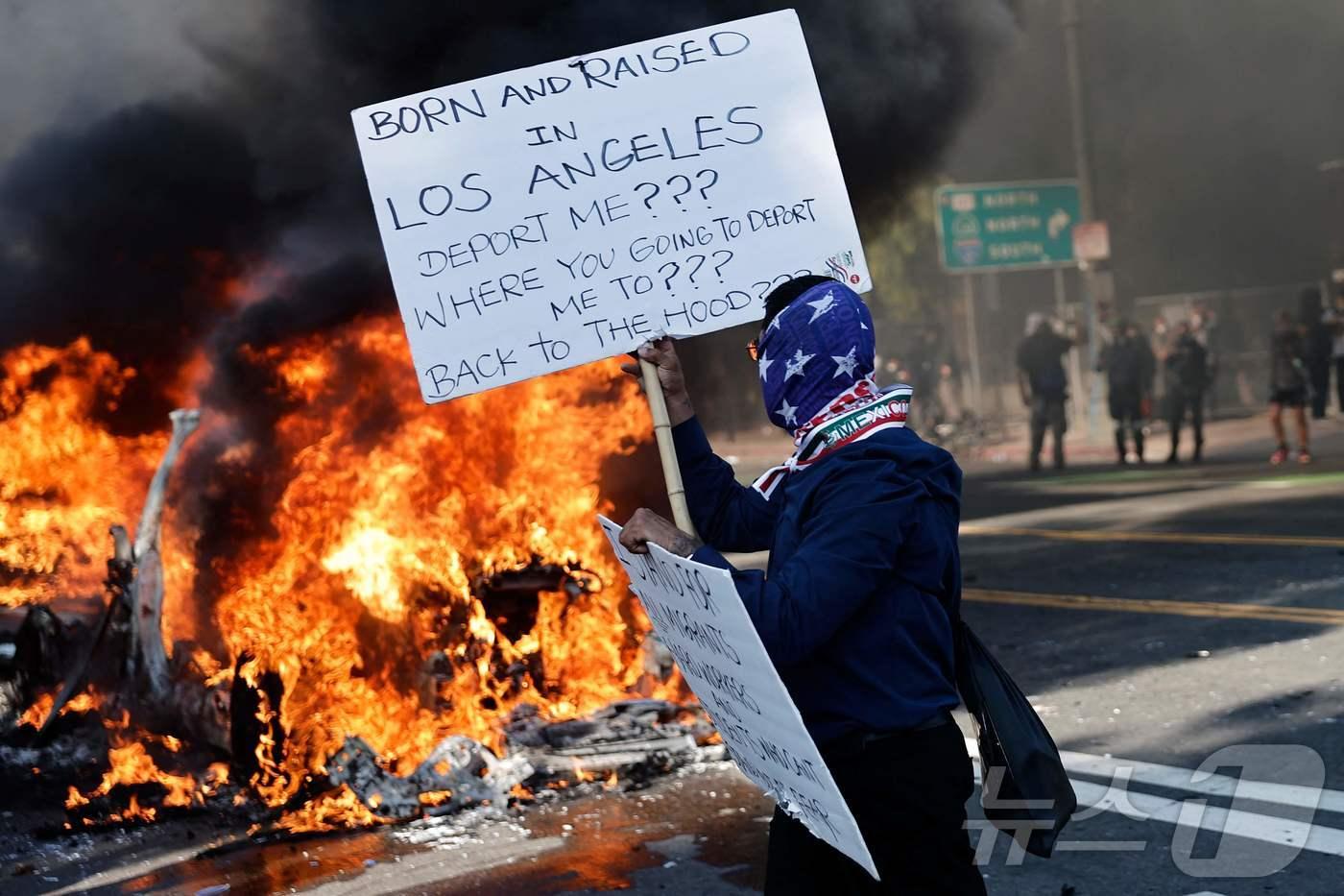 2025년 6월 8일 캘리포니아주 로스앤젤레스(LA)에서 사람들이 불타는 웨이모(Waymo) 차량 옆에 서 있다. 이민 단속 과정에서 경찰과의 충돌이 이틀간 이어진 후, 도널드 트럼프 행정부가 캘리포니아주의 반대에도 불구하고 주방위군을 투입하면서 도시 내 긴장이 고조되고 있다. 2025.6.8 ⓒ AFP=뉴스1 ⓒ News1 강민경 기자