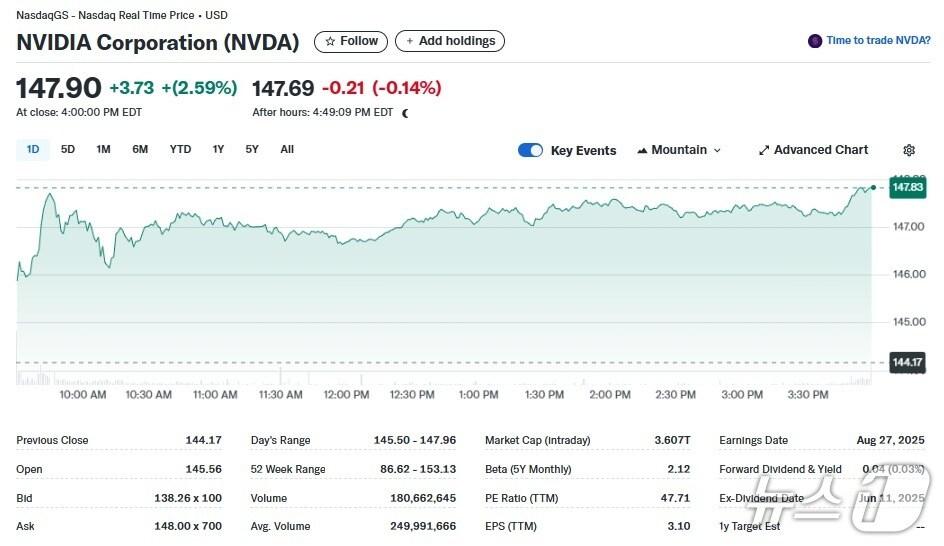엔비디아 일일 주가추이 - 야후 파이낸스 갈무리관련 키워드엔비디아반도체주이란-이스라엘 휴전박형기 기자 18일 오전 6시 마이크론 실적 발표, 또 AI 주 급락하나中 GPU 업체 메타X 상장 첫날 주가 755%까지 폭등관련 기사중동 휴전+파월 발언, 미증시 3대지수 모두 1% 이상↑(상보)"반도체株 랠리" 삼전, '6만전자' 돌파…SK하닉은 '28만닉스'로 최고가[핫종목]이란 확전 원치 않아…미증시 일제 랠리, 나스닥 1.52%↑(상보)