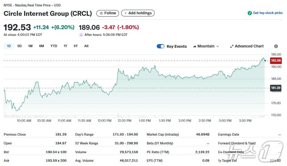 서클 일일 주가추이 - 야후 파이낸스 갈무리관련 키워드Blockchain서클신탁은행스테이블코인박형기 기자 18일 오전 6시 마이크론 실적 발표, 또 AI 주 급락하나中 GPU 업체 메타X 상장 첫날 주가 755%까지 폭등관련 기사[속보] 서클 신탁은행 추진, 주가 6% 급등500% 폭등한 서클 신탁은행 설립 추진, 인가 나면 또 폭등할 듯