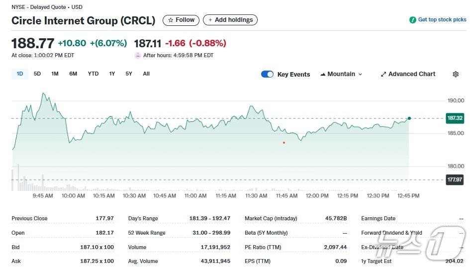 서클 일일 주가추이 - 야후 파이낸스 갈무리스테이블코인 발행사 서클이 5일(현지시간) 뉴욕증시 상장에 성공했다. 회사 간부들이 개장벨을 치며 환호하고 있다. ⓒ 로이터=뉴스1 ⓒ News1 박형기 기자관련 키워드Blockchain서클스테이블코인USDC박형기 기자 18일 오전 6시 마이크론 실적 발표, 또 AI 주 급락하나中 GPU 업체 메타X 상장 첫날 주가 755%까지 폭등관련 기사서클 오늘도 5% 급락, 지난 5일간 18% 폭락원화 스테이블코인도 해외 블록체인으로…서클 '아크'에 몰린 韓 기업들[기자의 눈]서클 사장의 국빈급 방한, 'K-스테이블코인 거품론'의 민낯'서클 방한 북새통'에도 스테이블코인 제도화는 '엇박자'…"골든타임 놓칠라"원화↔USDC 환전 쉬워지나…'광폭행보' 서클, 한국 기업과 어떤 협업할까
