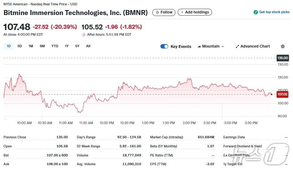 비트마인 일일 주가추이 - 야후 파이낸스 갈무리관련 키워드Blockchain.비트마인톰 리박형기 기자 18일 오전 6시 마이크론 실적 발표, 또 AI 주 급락하나中 GPU 업체 메타X 상장 첫날 주가 755%까지 폭등관련 기사비트마인 오늘도 40% 폭락, 거품 꺼지는 듯비트마인 또 27% 폭등, 5일간 무려 1238% 폭등