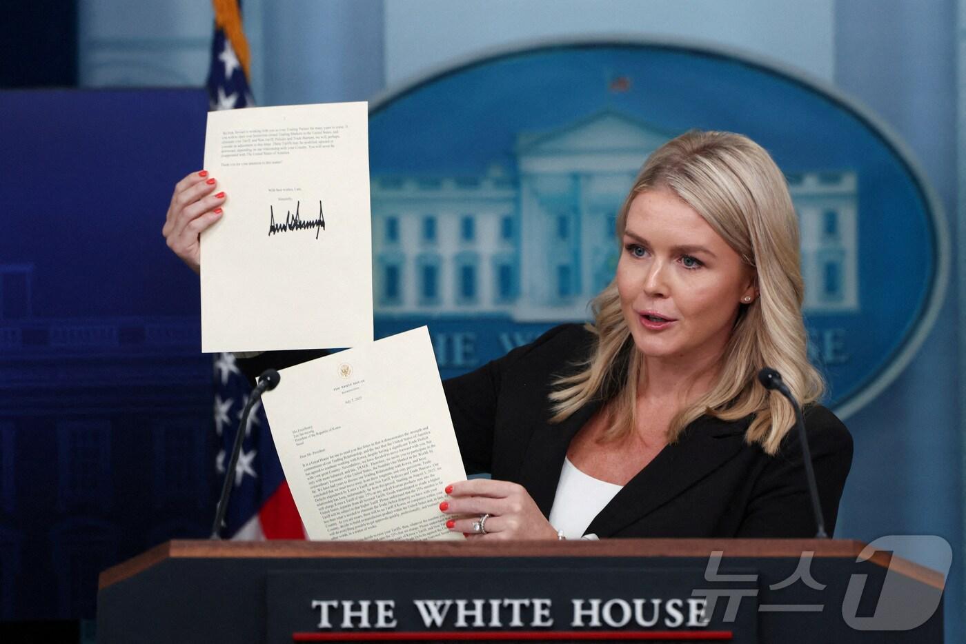 캐롤라인 레빗 백악관 대변인 7일(현지시간) 워싱턴DC 백악관 열린 정례 브리핑에서 도널드 트럼프 미국 대통령이 이재명 한국 대통령에게 보내는 관세 서한을 들어 보이고 있다.2025.07.07 ⓒ 로이터=뉴스1 ⓒ News1 류정민 특파원