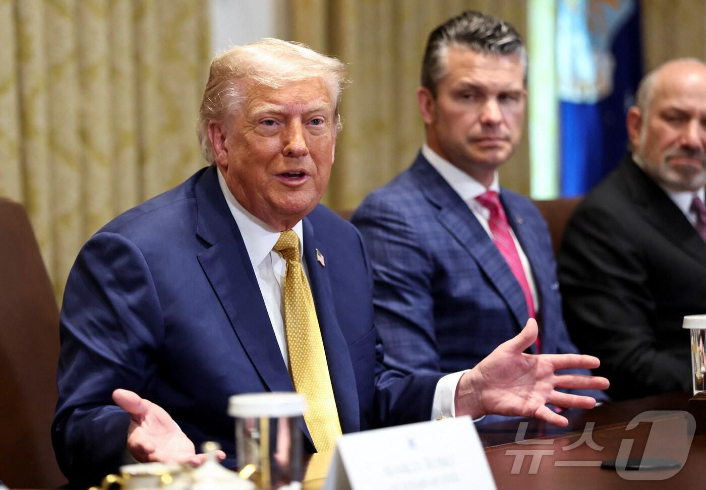 도널드 트럼프 미국 대통령이 8일(현지시간) 워싱턴DC 백악관에서 열린 내각 회의에서 발언하고 있다. 트럼프 대통령은 주한미군을 언급하면서 "한국은 미국에 너무 적게 지불하고 있다"라며 "한국은 자국 방위비를 스스로 부담해야 한다"라고 말했다. 2025.07.08. ⓒ 로이터=뉴스1 ⓒ News1 류정민 특파원