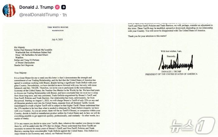 필리핀은 17%에서 20%로 상향되고 이라크는 39%에서 30%로 하향8월 1일부터 발효…상호관세 부과 대상국 총 20개국으로 늘어도널드 트럼프 미국 대통령이 9일 소셜미디어에 게시한 관세 서한. <출처=트루스소셜>관련 키워드트럼프관세트럼프관세관세서한관련 기사석학 후쿠야마의 경고 "세계 민주주의, 11월 美중간선거에 달려"[새해 트럼프는] 대법 관세 판결에 종전·중간선거 '가시밭길'[새해 미중관계]"트럼프-시진핑 휴전 오래 못가"…4대 뇌관 점검[뉴욕마감] 산타랠리 없이 4거래일 연속 하락…나스닥 0.76%↓[신년사] 정명근 화성시장 "4개구청 체제, 시민 체감 행정 만들 것"
