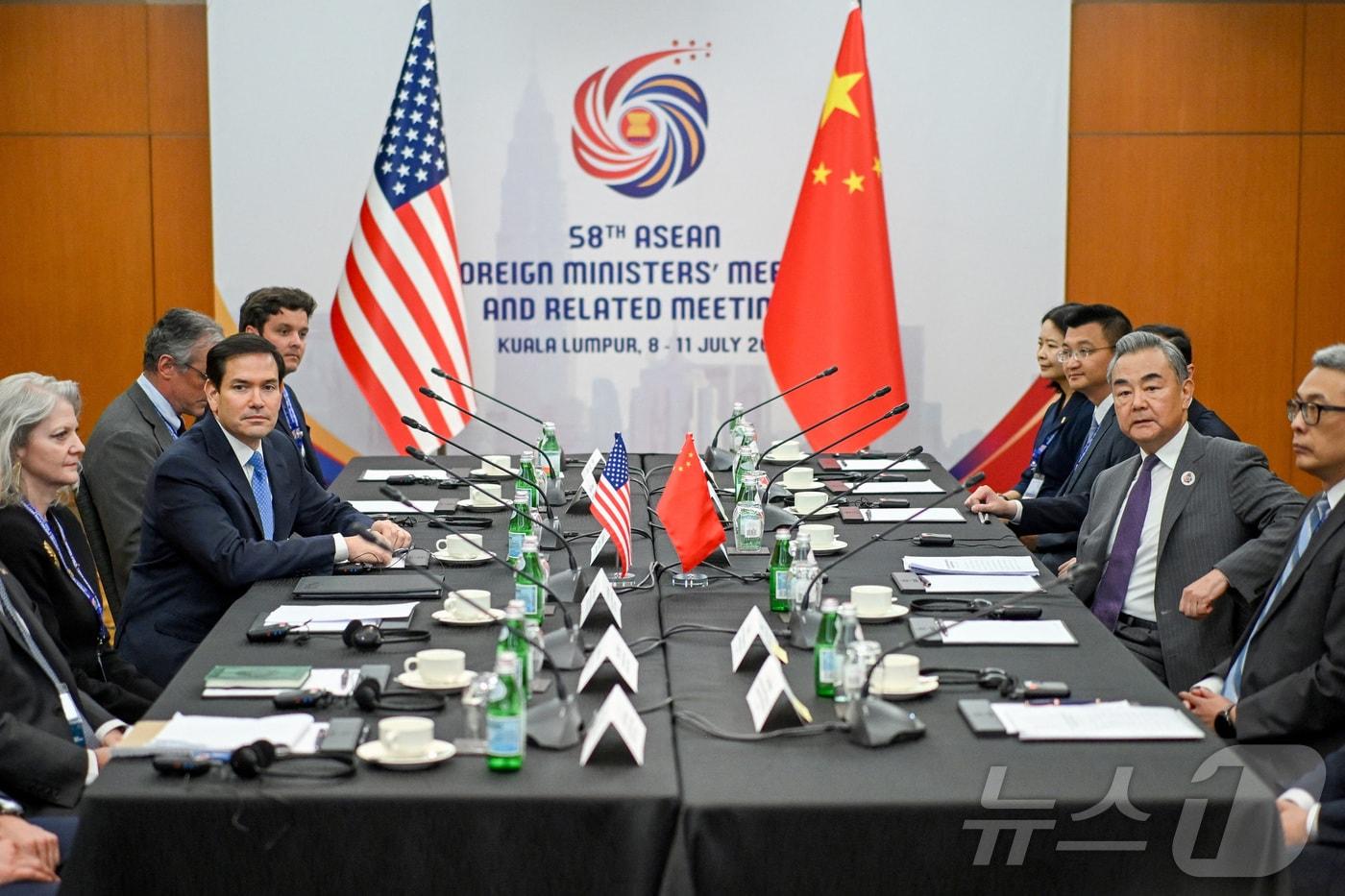 11일(현지시간) 마코 루비오 미국 국무장관과 왕이 중국 외교부장이 말레이시아 쿠알라룸푸르에서 열리는 아세안(ASEAN·동남아시아국가연합) 외교장관 회의를 계기로 회담을 갖고 있다. 2025.07.11 ⓒ 로이터=뉴스1 ⓒ News1 김지완 기자