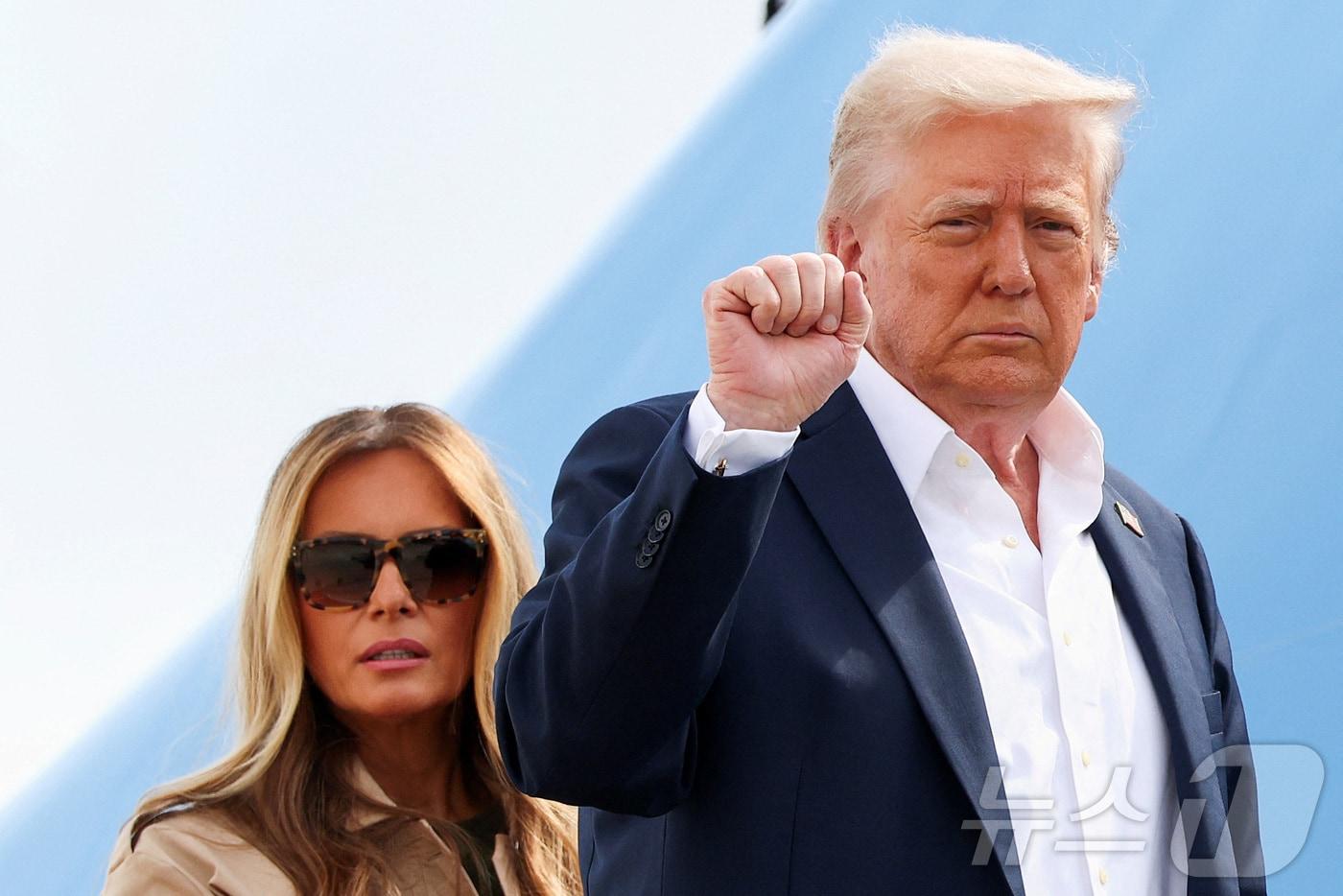 도널드 트럼프 미국 대통령이 11일(현지시간) 메릴랜드주 앤드루스 합동 기지에서 멜라니아 여사와 함께 에어포스원에 탑승하기 전에 주먹을 쥐어 보이고 있다. 트럼프 대통령은 이날 텍사스 홍수 피해 지역을 둘러볼 예정이다. 2025.07.11 ⓒ 로이터=뉴스1 ⓒ News1 류정민 특파원