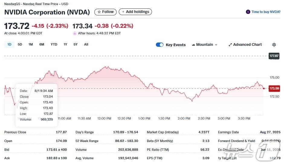 엔비디아 일일 주가추이 - 야후 파이낸스 갈무리관련 키워드엔비디아반도체주중국웨탄박형기 기자 18일 오전 6시 마이크론 실적 발표, 또 AI 주 급락하나中 GPU 업체 메타X 상장 첫날 주가 755%까지 폭등관련 기사S&P 0.6% 상승, 사흘 연속 올라…산타랠리 기대감 고조[뉴욕마감]엔비디아 0.64% 하락에도 반도체지수는 1.29% 상승(종합)엔비디아 0.33% 하락하자 반도체지수도 0.04%↓(종합)중국 H200 사용 금지할 수도…엔비디아 0.33% 하락(상보)미 대중 수출 허용, 엔비디아 급등…반도체지수 1.10%↑(종합)
